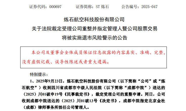 ST炼石于今年年初公告,公司董事会同意公司向有管辖权的法院申请重整及预重整。9月23日,公司收到成都中院送达的(2025)川01破申19号《民事裁定书》及(2025)川01破13号《决定书》,成都中院裁定受理公司的重整申请,并指定北京金杜(成都)律师事务所担任公司管理人。
