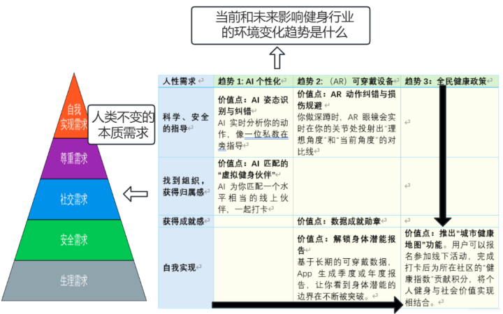 当然这里的举例只是我作为运动健身行业的外行随便写的,所以你能看到其中一些创新点早就投入现实过了,因为其中的各种趋势也就是我们的x轴我这里写的比较局限,更加专业深入的调研能获得更优质的结果。